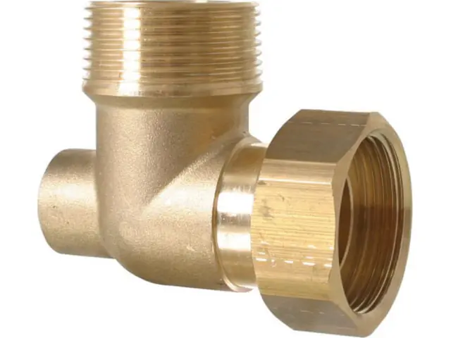 Eckverschraubung für Heizungs- und Warmwasserinstallationen, geeignet für Winkelverbindungen mit Außengewinde, Überwurfmutter und Innengewinde, inklusive Dichtung.