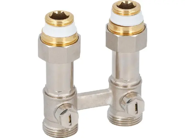 Der Zweirohr-Hahnblock mit Ausgleichsteleskop ist ideal für Zweirohrheizsysteme. Er verbindet einen DN20 (3/4″) AG-Übergang mit einem DN15 (1/2″) Heizkörperanschluss, bietet eine absperrbare Teleskop-Anschlussarmatur und ermöglicht bis zu 25 mm Höhenausgleich.